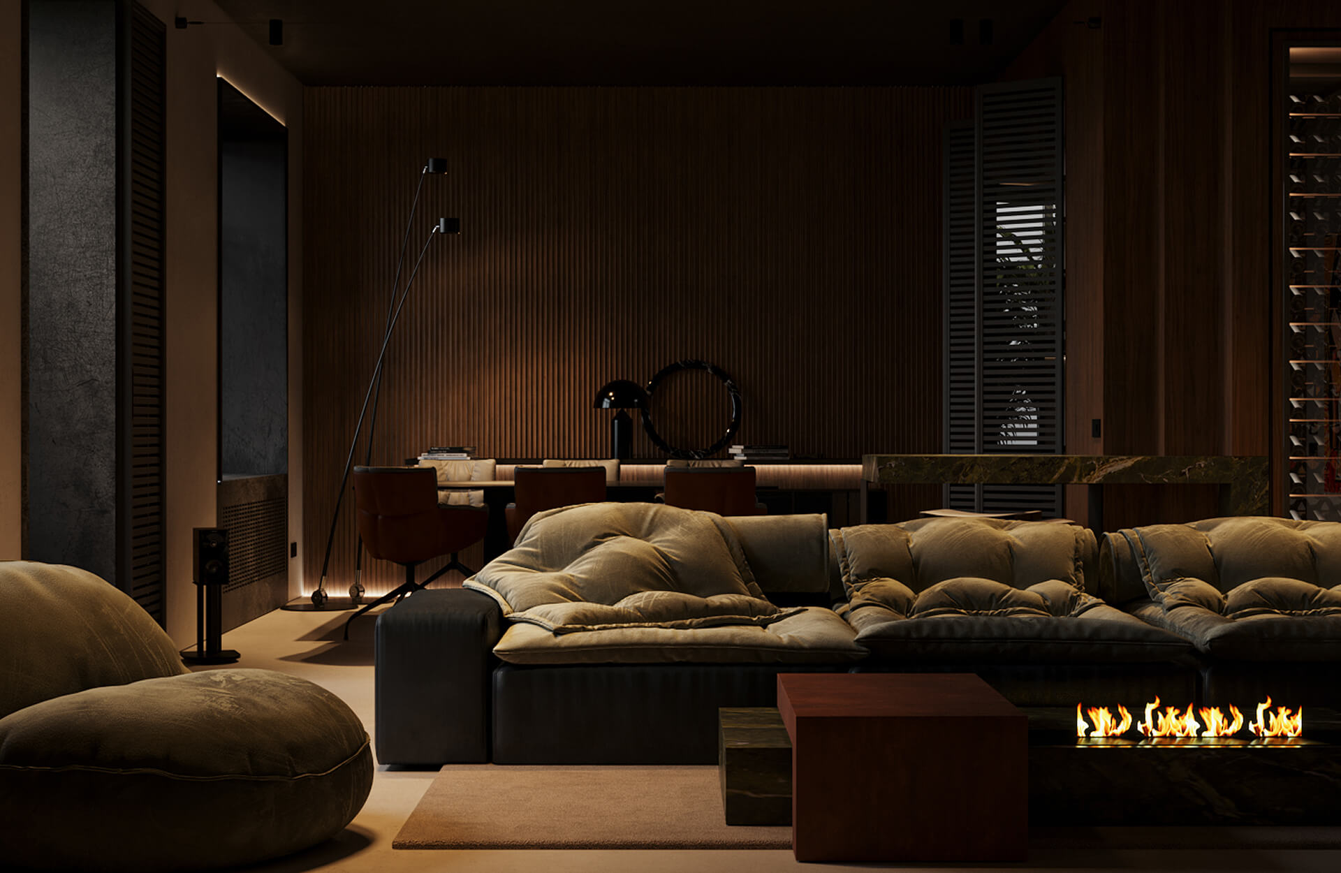 Subtle lighting highlights architectural features and artwork, creating an intimate atmosphere. This includes recessed lighting and stylish modern fixtures that complement the dark tones of the furniture and fittings. Unique architectural features such as curved walls and built-in niches are used to create visual interest and break up the monochromatic scheme.